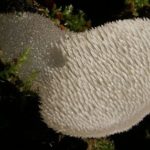 The Scaly Hedgehog (Sarcodon imbricatus) looks very much like a hedgehog mushroom but with large, dark, raised scales on the cap. Toothed Jelly (Pseudohydnum gelatinosum) looks very vaguely like a hedgehog mushroom, except it is translucent white with a gelatinous texture. Both are edible, though some people find the Scaly Hedgehog terrible-tasting—apparently this is not a difference of opinion about the taste, but an actual difference in perception, perhaps similar to the way cilantro tastes like soap to some. The Toothed Jelly is merely rumored to be bland.